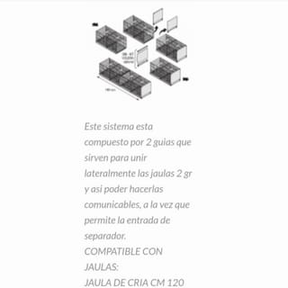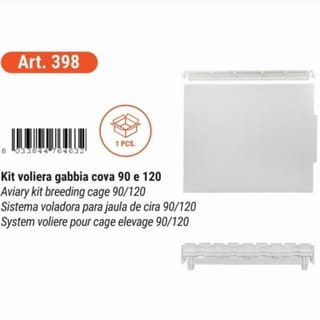 Aviary System Cage 90 - 120cm Art.398 www.2gr.it Made in Italy Item code:398 EAN Code:8033844764632 White plastic cage system for 90 and 120cm breeding cages. Allows the cages to be combined together to form a long flying cage. Actual Size Width : 40cm x Height 44.5cm ●The system consists of 2 guides that serve to connect the 2 gr cage laterally and thus make it communicable, while allowing the entry of the separator. ●The system consists of: 1 plastic open side, 1 plastic divider and 1 white plastic divider. ●Compatible with 2gr italian cage-code size 120cm: code 400/401/402/403 ●Compatible with 2gr italian cage-code size 90cm: Code 420/421 ● System to be connected to a 120cm size cage to combine two cages and form a single cage of 240cm ● The system will be connected to a 90cm size cage to combine two cages and form a single 180cm cage ●Plastic dividers allow for the division and union of cages based on the needs of the farmer. ●This high-quality and perfect Nursery Cage System is ideal for installing multiple cages ● Made with safe and non-toxic materials. ●Easy to install. ● Hygienic and easy to clean ● Slide the plastic side to install more cages