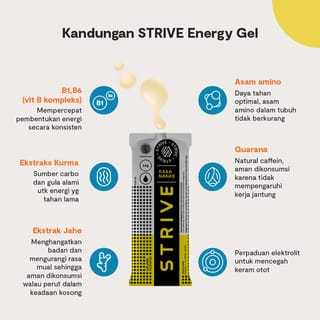 STORE NOTE : Operational schedule: Monday - Friday, hours: 8.30 am - 5.30 pm For Saturday, Sunday orders & Holidays will be processed on Monday or on weekdays Strive Energy Gel Pineapple - 24 gr Flavor: Pineapple Quantity: 5 sachets What is Strive Energy Gel? NEW! STRIVE Energy Gel comes as an Energy Booster to ensure you get extra energy and can achieve perfect sports performance. The gel form is easy to consume even in high-intensity cardio sports such as running or cycling. Contains 90 Calories and is made up of: Maltodextrin, Date Extract, Ginger, and Amino Acids. Why Strive Energy Gel? STRIVE Energy Gel contains maltodextrin which acts as the main fuel because it is quickly absorbed by the intestines and raises blood sugar faster. In addition, there are also various nutrients that support optimal body mechanisms. Strive Energy Gel is good to use during and after exercise How to Store: For storage please store in a dry place and not in the sun.