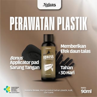 ⠀ MINISTRY OF HEALTH NO : PKD 20310120877 Nutens Idress functions to protect and moisturize the exterior and interior plastic parts of cars and motorcycles. It can be used for plastic, leather and rubber media so that it is not easily dull due to sun oxidation. In contrast to Nutens Blacknut which is more specialized in blackening dull plastic. Idress nutens are specially made for maintenance so that the applied medium can be protected from the sun's UV rays. Nutens Idress can be applied once every 1 month, it is very suitable for use after the application of Nutens Blacknut (if applied to exteriors). What are the advantages of Nutens Idress? - Already have a Ministry of Health permit. - Helps maintain plastic and car interiors so that the color is maintained. - Safe to use for the interior and exterior of the vehicle. - Provides a glossy effect on the applied media. - Very easy to use. - Economical use can be for more than 5 motorcycles and cars. Nutens Idress is best used for: 1. Rough plastic on the motor such as dashboard, fender, etc. 2. Rough plastics on cars such as fender trim, wiper chamfers and rubber lists. 3. The interior of the car is made of plastic, leather and rubber such as dashboard, doortrim, seats, handrests, headrests etc. Every purchase will get: - 1 Nutens Idress fills 90ml - 1 Applicator pad - 2pcs Gloves How to use: 1. Use gloves. 2. Pour the idress liquid on the applicator pad. 3. Apply it evenly on your vehicle's plastic media.
