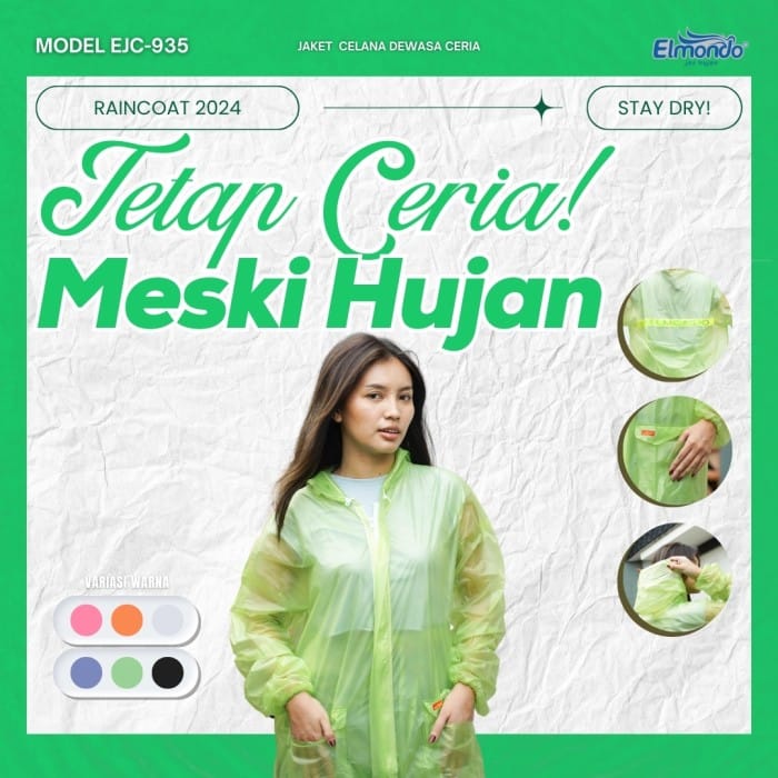 LATEST!! THE CHEERFUL RAINCOAT FROM ELMONDO NOW COMES WITH A SUIT VARIANT CHEERFUL RAINCOAT SUIT 935 ORIGINAL BEFORE ORDERING, PLEASE NOTE, THAT THIS RAINCOAT HAS NO WARRANTY, WE DO NOT CHECK FIRST, BECAUSE THE GOODS ARE DIRECTLY FROM THE FACTORY, DO NOT ACCEPT RETURNS, COMPLAINTS OF TEARS OR HOLES... BECAUSE THIS IS A CHEAP RAINCOAT IS FESTIVE SO IF YOU AND SISTA ARE WILLING PLEASE ORDER Product Details: - On the wrist there is rubber so that it closes the wrist tightly hands to prevent water from penetrating to the arm - This Raincoat is also equipped with a colored scotlight line - PVC material - Suit models of shirts and pants - There is a scootlight on the back - All sizes of lengths - Available colors according to the product variants Jacket: - Jacket length : 72 cm - Jacket width measured from armpits to armpits: 61 cm - Arm length measured from armpit: 52 cm - Diameter of the arm circle measured from the armpit: 48 cm Trousers: - Pants length : 105 cm - Thigh circumference diameter measured from crotch: 78cm - Diameter of the waist trousers when pulled up maximum: 121 cm With a fairly wide pant size, this type of raincoat is suitable for wearers who have a fairly large thigh size... Thickness of rubber material 0.06mm with rubber material with good degree of flexibility *Happy shopping and thank you*