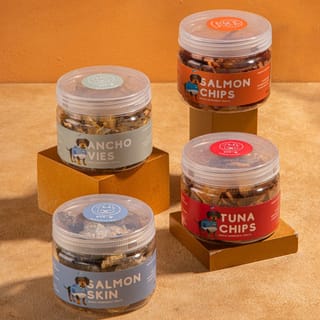 Salmon Skin Single Ingredient Treats Netto: 50 g Our single treat ingredients are specially crafted to be irresistibly crunchy. These snacks are not made using the dehydrated method but using a method that we called "crisp up". This method uses high temperatures that will make the snack crunchy like "chips", delivering a delightful texture experience that your fur babies will adore. These snacks are: - Gluten free - Human grade - No preservatives - No added sugar & salt - No Filler - High quality ingredient - All natural ingredients Salmon Skin Benneftis: - A great source of protein and omega-3 fatty acids - Improves healthy fur &; skin - Promotes healthy joint - Boost immune system Consume in 1 month, keep it at a dry place or "STORE INSIDE REFRIGERATOR FOR LONGER SHELF LIFE" NO RETURN, NO EXCHANGE All Photos are belong to Dogs Factory. Do not steal, use, post to social media without permission