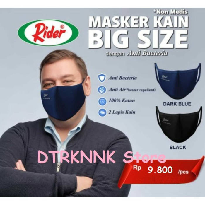Rider Cloth Mask BIG SIZE Anti Bacteria Non Medical Color BLACK and DARK BLUE Price per unit (1 pc) PLEASE click the Color Variant option according to what you want to buy, yes, if the Color Variant is inactive, it means that the stock is empty. Thanks. CAUTION: - This Rider brand Cloth Mask is NON MEDICAL - Avoids dust and droplets (liquid splashes) - Prevents bacteria from multiplying - Washable - Soft and comfortable - Consists of 2 layers of fabric - Material 100% Cotton Care Instructions: - Hand wash and with the same color - Do not use bleach - If needed iron at low temperature - Do not do rotary drying Made in Indonesia. Produced by Rider Group www. rider.co.id For other RIDER Mask Variants that we sell, you can check as follows: - Adult Adult Non Medical Anti Bacteria Anti Bacteria Rider Cloth Mask https://www.tokopedia.com/dtrknnk/masker-kain-rider-anti-bacteria-non-medis-hitam-dewasa - Non Medical HIJAB Anti Bacteria Rider Cloth Mask White / Pink / Black https://www.tokopedia.com/dtrknnk/masker-kain-rider-anti-bacteria-non-medis-hijab-putih-pink-hitam - ANAK Non Medical Anti Bacteria Rider Cloth Mask All Color / All Colors https://www.tokopedia.com/dtrknnk/masker-kain-rider-anti-bacteria-non-medis-anak-all-color-semua-warna - Non Medical Anti Bacteria Rider Cloth Mask INDEPENDENCE SPECIAL EDITION https://www.tokopedia.com/dtrknnk/masker-kain-rider-anti-bacteria-non-medis-kemerdekaan-special-edition