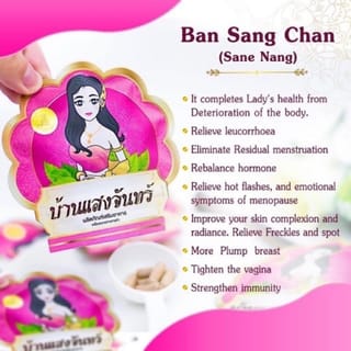 SANE NANG BAN SANG CHAN ORIGINAL THAILAND (HOLOGRAM ON THE PACKAGING) Contents: 10 capsules FDA No. 24-1-00761-5-0291 Supplements that help enlarge breasts while closing the vagina. SANE NANG has a HALAL label and passed FDA certification so it is safe to consume! Main benefits : - Enlarge breasts - Tighten sagging and drooping breasts - Close Miss V - Treat vaginal discharge problems - Normalize irregular menstruation Other benefits : - Smooth and moisturize the skin - Overcome hair loss amp; thicken hair - Relieve pain due to menstruation - Nourish nails - Prevent osteoporosis - Slow down menopause - Reduce acne - Make weight ideal - Increase sexual arousal - Improve blood circulation Drinking rules: 2 capsules a night before bedtime. Pregnant women and children are prohibited from consuming this. *ATTENTION: For complaints of goods that are less or not in accordance with what was ordered, please include a video proof of unboxing of the package. Filing a complaint without video evidence cannot be processed.