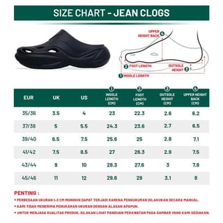 "Porto X represents a balanced lifestyle, offering style and functionality at the same time. This Porto X values innovation in comfort technology and puts a restoration-focused design at the forefront, supporting active individuals to revitalize their feet and body every step of the way. Porto X is committed to creating footwear that supports recovery after performance, allowing customers to recover comfortably while still looking stylish. JEAN Jeans Sandals – Futuristic, Comfortable, and Equipped with Recovery Technology Look different with Sandals Jean, futuristic clogs sandals that offer comfort and style. Equipped with maximum ventilation, these sandals keep your feet cool and dry all day long. Specially designed for fat feet, the Jeans provide extra space without putting pressure on the feet, providing more comfort while exercising. Recovery technology helps to recover the leg quickly, reduce fatigue, and provide additional support. Unique and stylish design, the Jeans are the right choice to look different with maximum comfort in every step. SUITABLE FOR FOOT SHAPE: NORMAL FOOT (Medium Arch) SUITABLE FOR FOOT PROBLEMS: - MORTON'S NEUROMA: MATERIAL SOLE: FULL EVA EVA Material: Lightweight and padded sole, providing extra comfort with every step. Easy to clean, so the shoes stay looking new for longer. Stable Elasticity: Naturally adjusts the shape of the foot, providing a comfortable fit that supports free movement. Proportional Arch: Soft material support arch insole will support every curve of the foot texture providing a smooth massage when stepping making the foot so comfortable AdaptiFoam: Flexible Material Technology that makes the material so soft and lightweight that it provides optimal protection. Futusitic, Stylish and Modern Design: Porto X offers a trendy look with a futuristic touch, bringing together modern style and comfort. The perfect shoe for those of you who want to look different on every occasion! SIZE CHART: IT IS IMPORTANT TO MEASURE THE SIZE BEFORE BUYING. LOOK AT THE PHOTOS WE HAVE PROVIDED ON THE PRODUCT IMAGES *IMPORTANT!! *: - PLEASE CONFIRM PRODUCT AVAILABILITY AND SIZE BEFORE PLACING AN ORDER - A DIFFERENCE IN SIZE OF 1-2 CM MAY OCCUR DUE TO MANUAL MEASUREMENTS. - WE DO NOT ACCEPT SIZE EXCHANGES FOR ANY REASON. - TO MAINTAIN THE QUALITY OF THE PRODUCT, PLEASE REFER TO THE MAINTENANCE GUIDE ON THE PICTURES WE PROVIDED. *RETURN CONDITIONS*: - READ THE RETURN TERMS IN THE GUIDE WE HAVE PROVIDED ON THE PRODUCT IMAGES. - RETURNS CANNOT BE MADE FOR ANY REASON WITHOUT PHOTOS & VIDEOS DURING UNBOXING WITHOUT INTERRUPTION."