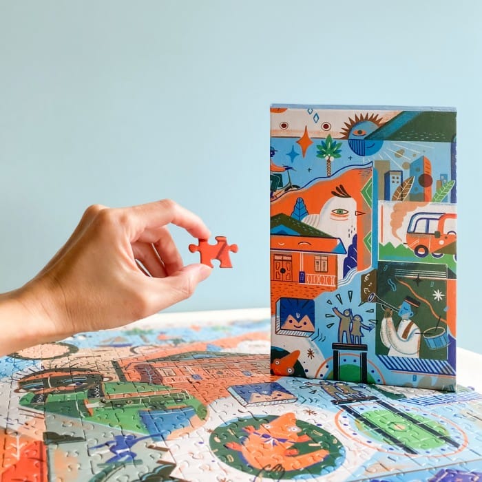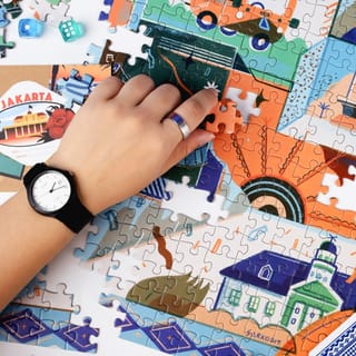 METROWARNA is a 500-piece jigsaw puzzle specially designed by Sarkodit for Rekarekat Puzzles' debut collection, SERI O1 – JAKARTA. Puzzle pieces are packed in a paper pouch and ships inside an exclusive, reusable magnetic box. Made from post-consumer recycled paper. Small parts not suitable for children under 3. Puzzle size is 57x42cm when completed. ABOUT THE ART Metrowarna captures the capital's colorfulness in song, dance, cuisine, and cityscapes, to paint a Jakarta whose character is the result of a rich mix of diverse people and ethnicities. ABOUT THE ARTIST Sarkodit is a freelance illustrator who was born and currently resides in Bandung. Having loved drawing since he was a child, he eventually went on to study Visual Communication Design at National Institute of Technology. On top of creating, he is also kept busy playing with his four beloved cats and tending to several plants on his apartment balcony. Got questions or want to share your experience? Send us a chat here or DM us on Instagram at @rekarekat!