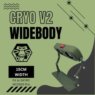 CRYO V2 WIDEBODY Foldable Charger Fan (Pure 2A adapter included) This fan is used to cool the battery during the charging process so that the Tamiya Mini 4WD battery charging process becomes more efficient. This design is optimized for the SKYRC NC2500 Pro charger Specifications: Housing 3D Print PLA+ 2 x 40mm Heavy Duty Ball Bearing Fan 1 x 5mm LED Voltage: 12V DC Current: 2A Power: 12W Fan rotation speed: 15,000 RPM WARNING! Due to the speed of the fan's rotation, the noise generated is quite noisy. Compatible for: Docking Mode (between the legs): SKYRC MC3000 SKYRC NC2200 SKYRC NC2500 SKYRC NC2500Pro SKYRC NC2600 Powerex MH-C9000 Powerex MH-C9000pro Standalone Mode (Not between the legs, but still suitable for use): Rydbatt 8 Slot Powerex 8 Slot And other chargers with maximum dimensions: -Width 15cm -Height (Thickness) 11cm Shipping Limits: Monday - Friday = Maximum at 14:00. After that it will be sent the next day Saturday = Maximum at 12:00 p.m. After that, it will be sent the next day Sunday = No delivery. Will enter delivery on Monday.