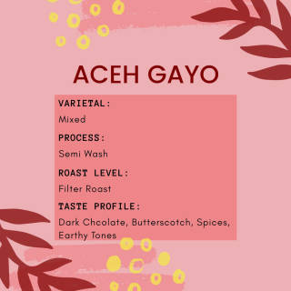Aceh Gayo Grade 1 Coffee Beans 250 gr nett Roast Level: Filter Roast Profile: Dark Chocolate, Butterscotch, Spices, Earthy Tones Region: Gayo Highlands, Aceh Altitude: 1300- 1500 MASL Process: Semi Wash Varietal: Mixed Suggested Brewing Method: - French Press - Pour Over - Aero Press - Filter Brewer Packing : Flat-Bottom with Zipper