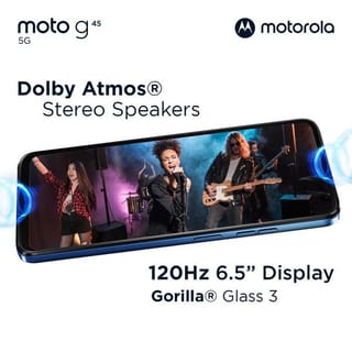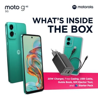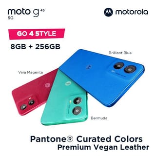 Motorola G45 5G 8+8/256GB Bonus 1. Get XL Starter pack + 45GB data package (for 1 year) 2. Get up to 1 year Ultimate package Vision+ Subscription plan 3. Get 20W Charger & Clear Case Specification: Processor Type : Snapdragon 6s Gen 3 (6nm) RAM memory : 8 + 8GB Storage Capacity: 256GB Operating System : Android 14 , upgradeable to Android 15 Model : Vegan Leather Pantone Curated, Glass front (Gorilla Glass 3) Network Connections: 5G Phone Features : Dolby Atmos Stereo speakers, Fingerprint (side-mounted), accelerometer, gyro, proximity, compass NFC Camera : Dual Camera Rear Main Camera (MP) : 50 MP Video Resolution : 1080p Front Camera (MP) : 16 MP Plug Type: USB Type-C 2.0 SIM card Slots : Shared SIM slot Battery Capacity : 5000 mAh Charger: 20W Display Size (inch) : 6.5" IPS LCD, 120Hz Screen Resolution : 720 x 1600 Whats in the box : 20W Charger, Casing, USB Cable, Guides, Sim Tool, Starter package from XL Warranty: 1 years