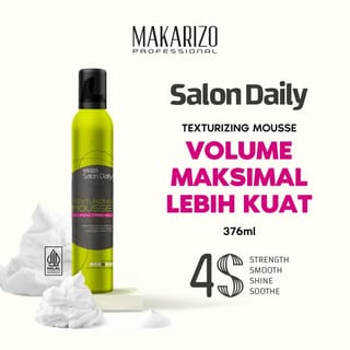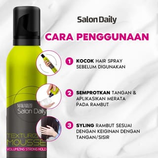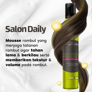 Salon Daily Texturizing Mousse keeps the hairstyle long-lasting and shiny. It can provide additional volume to the hair and a long-lasting texture. - HOLD LEVEL 4 HOW TO USE : Shake the Can well and hold it upside down. Pour Salon Daily Texturizing Mousse the size of a golf ball into the palm of your hand Apply to damp hair from root to tip. *((Only for the JABODETABEK area))*