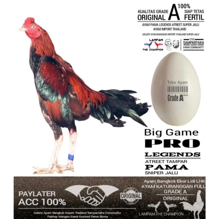 description Ori Pama Chicken Eggs FROM SAMPARTAKA PLAY PRO BIG COURT LAMPAM THE CAMPION COMMUNITY 7 DAYS WARRANTY according to the caption in the picture The warranty applies to eggs and purchases over 4 eggs Reading Culture The eggs are taken from Tahiland imported Pama chickens which have won big invitations in certain regions Pama Ori Chicken Specs : Pamagast chicken is also a type of pama chicken that is quite interesting. Since its appearance, gostan chicken has been very liked and crazy by fight chicken hunters. Gostan chickens have a larger posture with a unique fighting style of backdrop athletes SOME TYPES OF PAMA CHICKEN - Pama gostan - Pama Ori - Pama Ninja - Brazilian pama - Pama Myanmar - Pamangun ACCURACY OF THE PAMA CHICKEN PUNCH : - the direction of the punch of the neck and head of the chicken - Accurate lower jaw - Entering at the front of the clock - Hit hard towards the neck and cache the chicken Characteristic characteristics of Pama Original chicken: - The general size or weight of a pama chicken is only .2.3-2.9 kg. Another characteristic of the pama chicken is that it has round dry legs with yellow, blue, green and black colors or can be described with round dry legs and bright color patterns. Despite having a size and reinforcement that is not too large, pama chickens have dense feathers. But in terms of color, the color of the pama chicken is not very attractive. However, with a size that is not too large, it makes the pama chicken an agile fighting chicken. The fighting style of the pama chicken reaches 90% for the accuracy rate of shooting the opponent's head. In addition, the characteristic of the Pama chicken fighting style is by avoiding the opponent's attacks and swatting and ranging. Therefore, Ayam Pama often wins matches Pama chickens are also often used to beat Bangkok Pakhoy and Koytrad chickens The opponents that are definitely defeated by chickens are the following types of chickens - Pakhoy - koytrad - koyngon - control chickens - Technique chicken - Ganoi chicken - Saigon Chicken Above are the types that can be defeated by chicken pama with