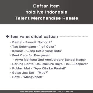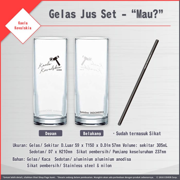 Resale items of talent merchandise from hololive Indonesia. ※This product is sold while stocks last. Sales period: November 30, 2023 ~ March 4, 2024 until 16:00 WIB ◇ "hololive Indonesia Talent Merchandise Resale": This product is an item produced & resold from hololive Indonesia's talent merchandise that was sold from July 2022 - January 2023, based on the results of a survey held from April 24 - May 8, 2023. 〈Delivery Period〉 End of November 2023~ ◇Special Items ・Juice Glass Set - "Want to?" Size: Glass/ Approx. D. Outer 59 x T150 mm Volume: approx. 305mL Straw/ D7 x H210 mm Cleaning brush / Overall length 237 mm Material: Glass/ Glass Straws/ aluminum, anodized aluminum Cleaning brush/ Stainless steel, nylon Japan Retail Price: ¥3,300 Prices listed in the store are inclusive of 11% Indonesia VAT ----- Product images are for illustrative purposes only, so there may be slight differences from the original product. The actual color display may vary. This is because each computer monitor, laptop, tablet, and phone screen has a different ability to display colors. Our stock is updated live, so the product is definitely ready as long as it is available in the store. Products that are sold out will most likely not be restocked again. ・Cut-off order processing hours: 12:00 PM local time for Instant Courier. 14:00 WIB for other deliveries. ・Orders that come in past these hours may be processed the next day. ・Update receipt D+1.