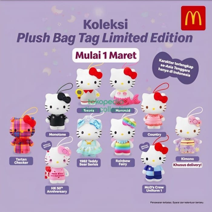 Sales Hello Kitty 50th Anniversary Limited Edition Hello Kitty Plush Bag McDonald's Indonesia PERIOD 1 1. HK 50 th Anniversary 2. Ballerina 3. Mermaid 4. Country 5. McD's Uniform 1 6. Tennis 7. Monotone 8. Rainbow Fairy 9. Tartan Checker 10.Kimono Height 10 cm New Condition/Seal Conform as figure 3,4,5 Complete with box & plastic seal IF THE AD IS STILL RUNNING, IT MEANS THAT THE PRODUCT IS STILL THERE/READY!