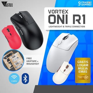 VORTEX INDONESIA OFFICIAL WARRANTY 1 YEAR . VortexSeries ONI R1 LightWeight Ergonomic Wireless Gaming Mouse - SENSOR : New / Updated version of PIXART PAW 3311 - Switch: Huano 20Million lifetime click - Scroll Wheel : TTC Encoders - Connectivity: Tri-mode (Wired, Wireless 2.4G and Bluetooth 5.2/5.4 ) - Cable: Type-C Paracord Cable - On-Board Memory - Max 18000 DPI - 400 IPS - Acceleration 40g - Polling Rate 125-250-500-1000Hz - SIZE 123.5*64*41mm - Ergonomic Shape - Super Light Weight 59g - Spare Mouse feet and FREE Grip Tape - VortexSeries 1 Year Warranty