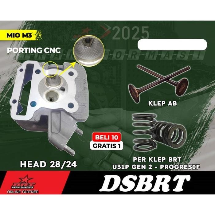 (PROMO = FREE PER PROGRESSIVE VALVE) HEAD BRT MIO M3 / MIO S / MIO Z / FINO FI 125 / X RIDE 125 / SOUL GT 125 ORIGINAL BRT Size 28/24 Available variants : - NON-PORTING - CNC PORTING Advantages of Head BRT: - Valve Size Width 28/24 - Faster heat release than iron (Engine temperature is cooler) - CNC / Non Porting - Sitting Installation with CRYO TECH method (Freezing) - Super Carbon Valve - Sitting Nickel Bronze
