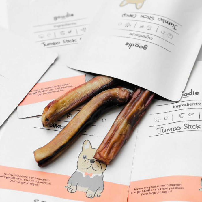 100% Beef Pizzle 1 pack 1pcs/ 3pcs - No Preservatives - No Additives - No Hormones - No Fillers We have two sizes of Bully Stick - Regular Sized Bully, Bully Stick - Jumbo Sized Bully, Jumbo Stick Benefits of Jumbo Stick: - Highly Digestible - High Protein Beef Muscle - Complete Source of Amino Acids - Supports dog Muscles, Brain, Skin & ; Coat Details on Instagram @Goodiedogsnack