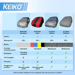 PLEASE WRITE THE COMPLETE CAR TYPE AND MODEL YEAR IN THE BOOKING NOTE. OTHERWISE, THE LATEST GENERATION MODEL WILL BE SHIPPED. We provide ultimate protection for your valuable assets with quality car covers at affordable prices. Advantages of our Keiko car covers: - 100% Polyester Material - Silver color - Strong and durable - According to size - Waterproof (Waterproof 85%), dust, sun and UV rays to protect car paint from dullness and no luminosity - Smooth material so it won't scratch the car - Easy to wash - Protection from wind with rubber at each end of the curve of the car ONLY FOR STANDARD CARS, if it has been modified please INFORM WARRANTY if the product does not match! Especially for white cars only for indoor or roofed use. For outdoor protection against white cars, please use type 3 layers deluxe or 4 layers ultimate: - 3 Layer Deluxe --> https://www.tokopedia.com/eggnoid/etalase/cover-mobil-keiko-deluxe - 4 Ultimate Layers --> https://www.tokopedia.com/eggnoid/etalase/cover-mobil-keiko-ultimate Please contact us directly if you have difficulty determining the right type of car cover. For other types of cars, you can check at our shop https://www.tokopedia.com/eggnoid/etalase/cover-mobil-keiko-standard ======================================================================= We also sell various MOTORCYCLE COVER TYPES only at the Eggnoid Store. Happy Shopping :) #SarungMobil #CoverMobil #bodycover