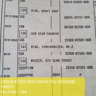 Price: 1pc/one piece (Including Cardboard Packing + Standard Bubble Wrap) Real pictures of each after the product is purchased in order to maintain your satisfaction, please reconfirm the real picture with chat (Photo OK) so you can process it immediately. Because the upload is fast based on the catalog, the volume/weight of the product is an estimate, if you want to buy it, please reconfirm it so you can recheck the real volume/weight so that there is no difference in shipping costs. Part Name : ring synchronizer no2 / ring chromes Part Number : 33368-87505-000 (Part Number is suitable, because different 1 number/1 letter will be different quality and different product) Brand : DAIHATSU GENUINE PARTS (Written brand is guaranteed to be 100% official product) Made in ... (check after the product is purchased) For cars: (Based on what we know from the catalog) Photo 1,2,3 *Daihatsu zebra S8# (OCT 1986 - ON) 4.5 photos *Daihatsu espass 1.3 S91 and 1.6 S92 (4 speed, 5speed) (Does not serve product similarity/modification) Additional Info : # = Zebra 1.0 S88 4speed and Zebra 1.3 S89 4speed, 5speed Real picture taken by SOEGIANTO MOTOR - Surabaya Shopping Online If you want to be safer, please add it to your shopping cart: ︎Extra Cardboard Packing https://tokopedia.link/msuTbrEAVib ︎Additional Bubble Wrap 50cm x 60cm https://tokopedia.link/NKWYf7cBVib Thank you for visiting, looking forward to your order. SOEGIANTO MOTOR - Surabaya Shopping Online (DAIHATSU, ISUZU, MITSUBISHI, SUZUKI, TOYOTA)
