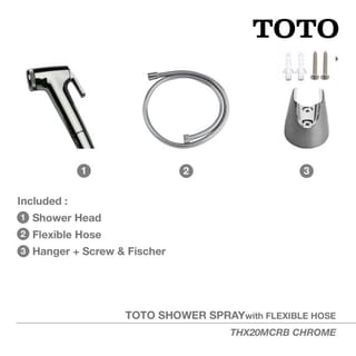 TOTO Shower Spray THX20MCRB | Jet Washer Shower Spray / Jet Shower Set which consists of: - Shower Head / Shower Head - Shower Hanger / Shower Hanger - Shower Hose / Shower Hose Min Water Pressure : 0.05 MPa Max Water Pressure : 0.4 MPa Flow Rate: 4 l/m Material & Color : Chrome NB : Product pictures are only as Illustration ** Terms and Conditions warranty claims can contact us via chat shop **