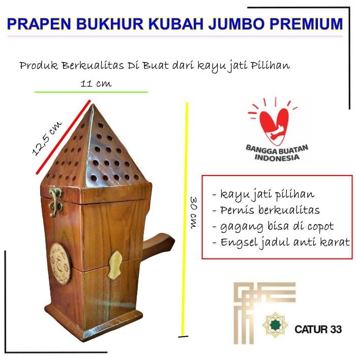 Buhur Antique Wood Level Krucut Tarim Jumbo Premium Product Info : Material : Krucut model level size Jumbo Model : tarim Jumbo Tarim Varnish type: natural premium Locking Padlock: Elegant and Classic Handle : Can be removed Produced : Jepara craftsman Indonesia Distributed: Chess 33 Bogor– Indonesia Latest Wooden Bukhur Container Teak wood material shaped like a pyramid or krucut, there is also a small drawer to store buhur or charcoal. The place to put the charcoal is closed to make it look neater and the ash used charcoal does not fly, the smoke of the fragrance will come out of the small holes in the buhur container Teak Bukhur Burnt Place It is a container for placing incense charcoal / bukhur Which is usually used for Mawlid Events, Recitations, and Others.