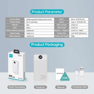 【KIVEE】International brand and quality, innovation is life, technology is the future. ♡About the original product: Guaranteed 100% original and new ♡Professional team provides one year warranty ※Say goodbye to slow charging, buy the right one on time. ※We have everything you want. ※KIVEE Introducing the Powerbank with a capacity of 20000mAh, designed for all your mobile charging needs. Featured Features: ❥1. High Capacity: 20000mAh for extended power. ❥Sec. 2. Dual Input and Output: Versatile charging options with dual ports. ❥Sec. 3. Fast Charging: 5V2.1A output ensures rapid power delivery. ❥Sec. 4. This reliable powerbank is perfect for keeping your devices charged on the go, making it an essential accessory for anyone who relies on their mobile phone and electronics daily. 【PRODUCT INFORMATION】 ✚Model: PT126 Max ●Color: White, Black, Green, Pink ● Material: White ABS ●Lithium battery capacity: 20000mAh ●Rated capacity: 12000mAh ● Rated energy: 74Wh/3.7V ● Input: 5V/2.0 (MICRO), Input: 5V/2.0A (TYPE-C) ●Output 1: 5V/2.1A, output 2: 5V/2.1A Total output: 5V2.1A (MAX) ●Product size: 141*70*29.5(L×W×H)mm ● Product net weight: 396g ●Package includes: 1x power bank 1x micro USB cable ✚Model: KV-PT211D ●Color: black, white ● Item Type: Power Bank ● Charging speed: 22.5W fast charging ● Display: Digital LCD ●Battery capacity: 20000mAh ● Rated capacity: 20000mAh; ● Rated power: 74Wh/3.7V ● 1-Micro Input: 5V/2.5A; 9V/2A ● 2-Type-C Input: 5V/2.5A; 9V2A ●1-USB Output: 5V/4.5A 9V/2.5A 12V/1.87A ●2-Type-C Output: 5V/3A 9V/2.5A 12V/1.87A ●Product size: 141mm*68mm*28.5mm, ●Net weight: 388g ✚Model: PT184 ●Product Name: Mobile Power ●Color: White, Black ●Battery capacity: 20000mAh ●Product Material: ABS+PC+ Cell ● Rated energy: 74Wh/3.7V ●Input: 5V-2.5A/9V-2A/12V-1.5A(Type-c) ●Output:5V-4.5A/9V-2.5A/12V-1.87A(USB) ●Output: 5V-4.5A/9V-2.22A/12V-1.67A(Type-c) ●Output:5V-2A (Lightning) ●Product Size:147*69*31mm ●Net / Gross Weight: 405g/450g ▸Delivery schedule: 1. From Monday to Friday, incoming orders will be processed immediately and processed according to the queue Customers are asked to wait patiently until the maximum delivery time stated in the application. 2. Open half day until 12 noon on Saturday. Any items that are not processed on Saturday will be processed on Monday. 3. On Sundays/holidays, our store is closed and no deliveries are made. Thanks! Hope you enjoy your shopping~ Don't forget 5 stars