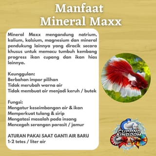 MINERAL MAX by ISHCO (indonesiansuperhmpk) We have researched and used it personally since 2017 to maximize the treatment of material fish / contest fish when progressing to handling in the contest arena. High quality imported minerals that contain sodium, potassium, calcium, magnesium and other supporting minerals that are specially formulated to spur the growth and development of betta fish and other ornamental fish. Superiority: Imported materials of choice Does not change the color of the water Does not make the water cloudy / buggy Function: Regulating water & fish balance Strengthens bones & fins Overcoming problems with gills Prevents parasitic/fungal attacks RULES FOR USING WHEN CHANGING NEW WATER 1-2 drops/liter of water (Just multiply by the volume of water used) Example: Mineral Max + Betta Booster Mineral Max + Catappa Liquid Mineral Max + Betta Booster + Ishco Catappa Liquid NO NEED TO USE FISH SALT ANYMORE BECAUSE MINERAL MAX ALREADY COVERS ALL THE MINERAL NEEDS IN FISH! 100ml Packaging FOR FRESHWATER ORNAMENTAL FISH NOT FOR HUMAN CONSUMPTION