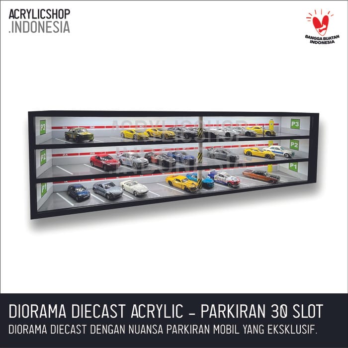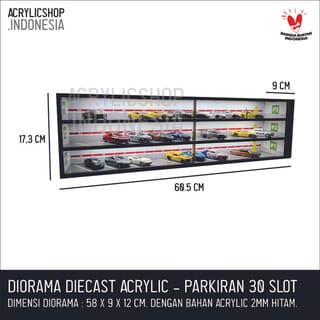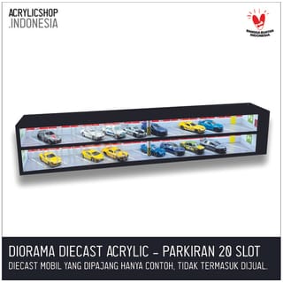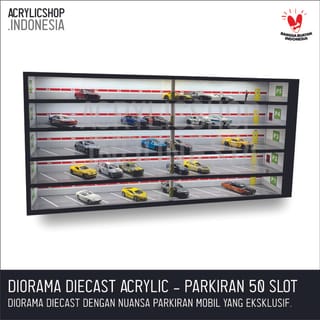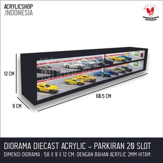 DIECAST ACRYLIC TOY CAR DIORAMA: HOTWHEELS, MATCHBOX, ETC. Diorama or miniature toy with a car parking theme made with acrylic base material with good quality. The acrylic made is cut using a laser machine so that the result is neat and precise. The images or parking themes that are made are also printed in good quality so that the colors are bright and durable. Parking Diorama Specifications: - Scale = 1:64 - Size = W. 60.5cm x L. 9cm x H. 12cm (capacity 20 slots) - Size = W. 60.5cm x L. 9cm x H. 17.3cm (capacity 30 slots) - Size = W. 60.5cm x L. 9cm x H. 28.5cm (capacity 50 slots) - Material = Black 2mm Acrylic The above price is for 1 diorama unit, including the AC LED light & its adapter. The toy car in the photo is not included in the product, just as an example. Free packing bubbles, cardboard and duct tape, as well as fragile stickers (fragile items). For custom products, you can directly WA at 0878-5523-3373 PLEASE ORDER! HAPPY SHOPPING! COMPLAINTS WITHOUT UNBOXING VIDEOS ARE NOT ACCEPTED!!