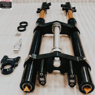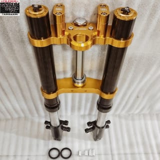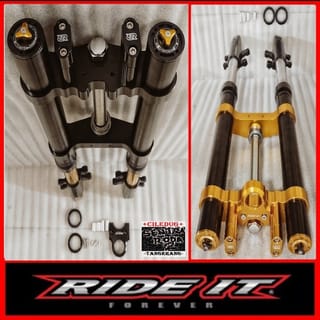 USD RIDE-IT ~ Up side down (USD) original Thai Size: +Diameter 51/850 +Length 75cm ~ Specs : Special Vixion / Byson / Scorpio PnP. ~ *Already equipped with ignition key cap, 1set comstir and spare shock sill. *And can also be applied to other motor2, such as R15,Cbr,cb 150,new mega pro Thunder, bajaj etc.. For those applied, you only need to lathe the middle axle of the triangle and make a front disc bracket. Can already double disc.. ~ Color : Gold/Black ~ Black/Gold ~ Black/Black