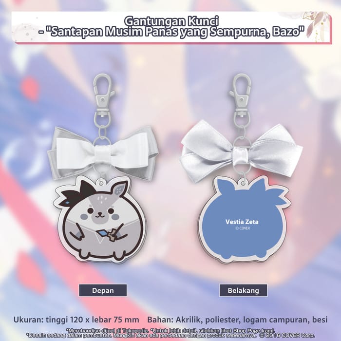 A special birthday item Vestia Zeta from Hololive Indonesia. ※This product is sold while stocks last. Sales period: November 7 ~ February 13, 2023 until 16:00 WIB ◇ Special Items ・Keychain - "The Perfect Summer Meal, Bazo" Dimensions: height 120 mm x width 75 mm Material: Acrylic, polyester, alloy metal, iron Japan Retail Price: ¥ 1,650 Prices listed in the store are inclusive of 11% Indonesia VAT ----- Product images are for illustrative purposes only, so there may be slight differences from the original product. The actual color display may vary. This is because each computer monitor, laptop, tablet, and phone screen has a different ability to display colors. Our stock is updated live, so the product is definitely ready as long as it is available in the store. Products that are sold out will most likely not be restocked again. ・Cut-off order processing hours: 12:00 PM local time for Instant Courier. 14:00 WIB for other deliveries. ・Orders that come in past these hours may be processed the next day. ・Update receipt D+1.