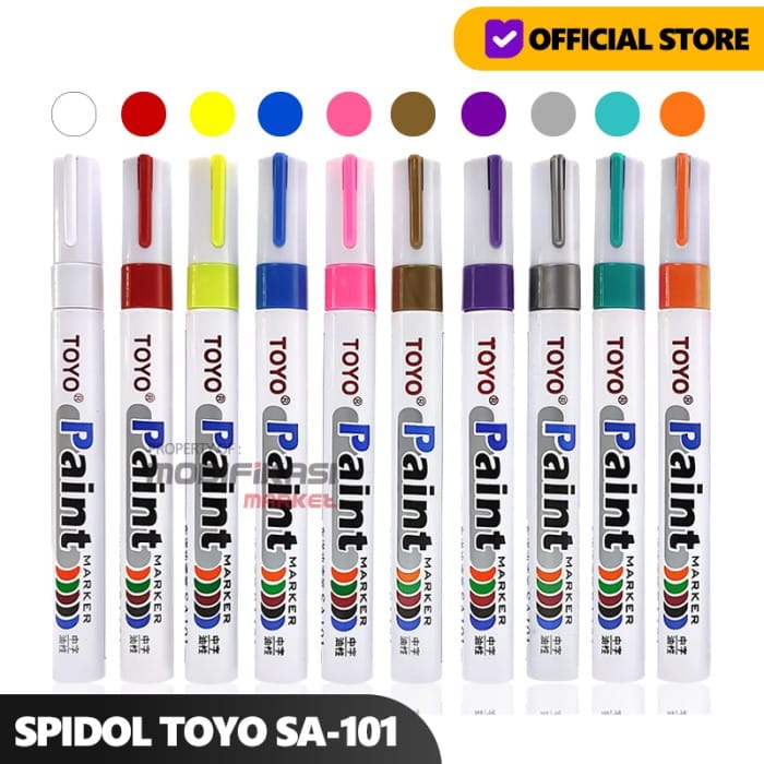 TIRE MARKER TOYO SA-101 (Price for 1 pcs yes) Specifications: Brand : Toyo Paint Marker SA-101 Contents: 12ml (for similar products it is usually 8ml if not original) Color: White, red, yellow, gold, silver, unggu, orange, pink, blue, green Function: - Markers for writing on tires to make them look more racing - Marker for writing in wood - Marker for writing on glass - Markers for writing on rubber, etc. Endurance: 6 months Usage: For 2 tires (motorbike) usually use 1 marker, for 4 tires (car) use 2 markers. Make it a habit to use a white base color before making a color on your tires to make them more economical and durable. How to use : 1. Shake the toyo marker 2. Press the tip of the toyo marker on any medium until the ink wets the tip of the marker 3. Write like using a marker as usual Thank you and happy shopping yaaa