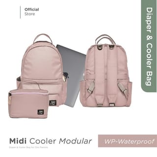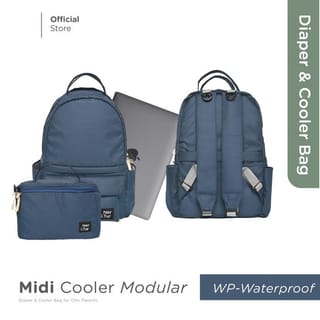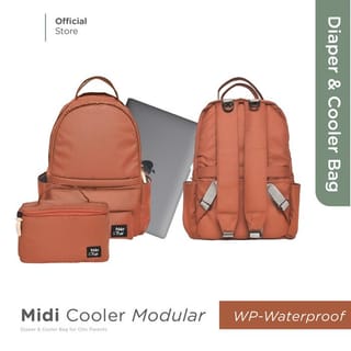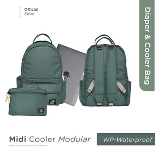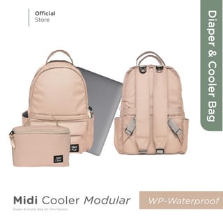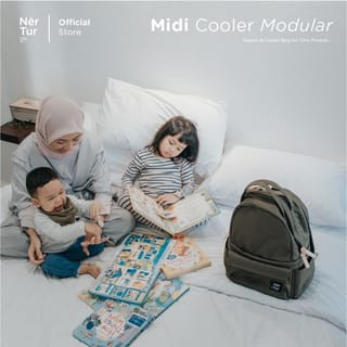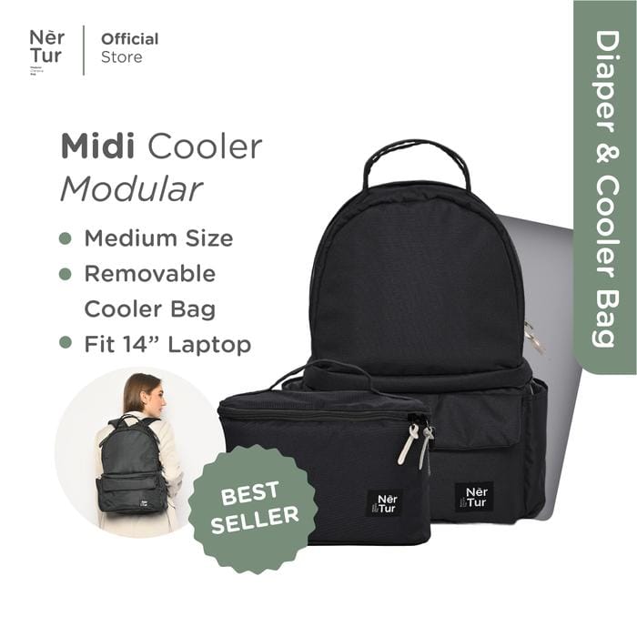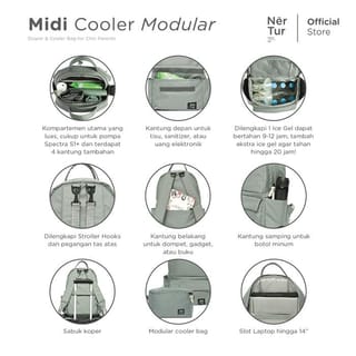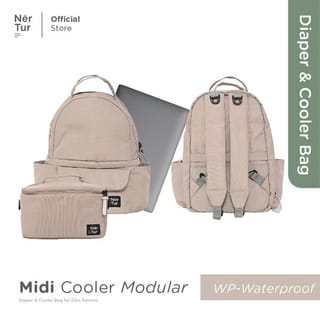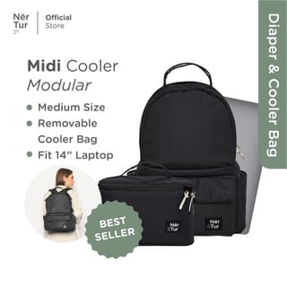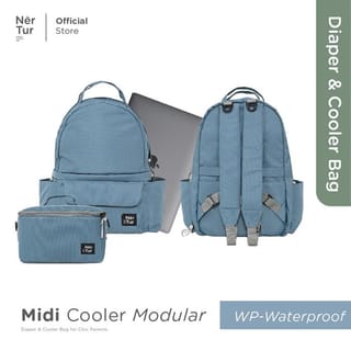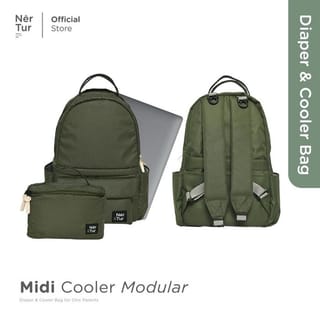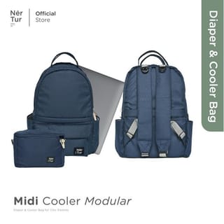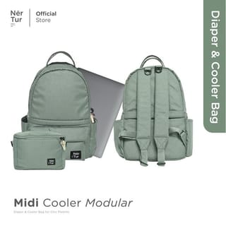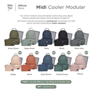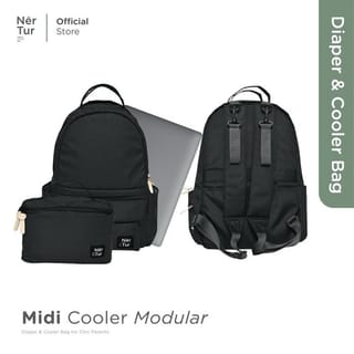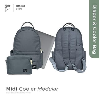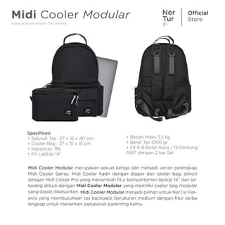 Modular Midi Cooler Modular Baby Bag Midi Cooler Modular is the third sequel and is a complementary variant of the Midi Cooler Series. The Midi Cooler comes with a diaper and cooler bag, followed by the Midi Cooler Pro which adds the features of a 14" laptop compartment and now followed by the Midi Cooler Modular which has a modular cooler bag that can be removed. Midi Cooler Modular is an option for NerTur Parents who need a medium-sized backpack with all-in-one features to accompany your parenting journey. Material: Outside: Black: Cordura Nylon (gloss, softer, lighter, stronger, water resistant) Other colors: Cordura Canvas (doff, stiffer, lighter, strong, water resistant) WP: Cordura Canvas Waterproof (doff, stiffer, lightweight, strong, waterproof) Inside: Light color inner lining (make it easier to find items) Cooler Bag: Thermal Fabric with leak-proof Heat Seal connection Size: + Whole 27 x 16 x 40 cm + Cooler Bag 27 x 15 x 15 cm + 19L Storage Capacity + Maximum Load: 5.5 kg + Bag Weight 1000 g + Shipping Weight 2 kg Specifications: + Fit Laptop 14" (Thick 14" laptops like Thinkpad & Gaming may need to upsize to All Day Pro, we recommend consul with admin first) + Front Compartment: 1 Pocket + Back compartment: 1 pocket + Side Compartment: 2 Pockets + Main Compartment: 2 pockets + Bottom Compartment: Removable Cooler Bag + Luggage Belt + Stroller Hook + Zipper and Puller : YKK + Fit 6-8 Glass Bottles / 15 bags of ASIP with 2 Ice Gel + Fit Spectra s1+ / s2+ + Fit Funnel Bottle Stand Up + Cooler Bag Able to withstand temperature more than 12 hours (with 1 Ice Gel) more than 20 hours (with 2 Ice Gels) FREE 1 Ice Gel 500 g 1 Set Stroller Clip For additional Ice Gel needs, you can add ice gel products to the basket separately — We accept Gift Wrapping Services & additional Greeting Cards to give gifts to the people closest to us