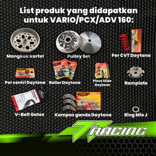 77 RACING Full complete CVT upgrade package Package Contents : - Custom Kartel Double Bowl - 13.5 or 13.8 Pulley Fan (Please Request) - 13.5 or 13.8 roller housing + roller line dredge (please request) - Per CVT Daytona 1500 or 1000 Rpm (Please Request) - Roller Racing Daytona 10-11-12-13-14-15-16 Grams (Please Request) - Per Dual Pads/Per Centrik Daytona 1500 or 1000 Rpm (Please Request) - Daytona Double Pads - Ramplate - Slider Piece Daytona - Vbelt Racing GATES (because Daytona is not ready) - Mio J Pulley Ring -Key -Sticker Please choose the available motorcycle type variations: - Vario 160 - PCX 160 - ADV 160 The guarantee of the product you order will reach you in good condition and according to the order, if there are any obstacles related to the product and delivery, don't hesitate to consult with us, we will complete it up to 100%.